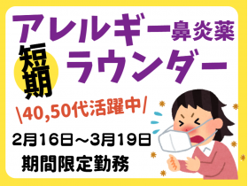 | 仕事内容 | ◎短期勤務!未経験者歓迎! ◎扶養内×Wワーク(副業)可能! ◎年齢不問!中高年・シニア在籍! 40代、50代はもちろん、60歳以上の方も活躍! \毎年恒例!リピータさん多数の案件がスタート/ 「アレルギー専用鼻炎薬」専属ラウンダーのお仕事が今シーズンもスタート! 全国で一緒に開始する仲間がいるので、ラウンダー業務が初めての方も安心です。 採用者人数が限られています。 決定次第、募集を終了しますのでお早めにご応募ください! <給与> 日給1万1000円 <経費> ・車両使用料支給/1日1019円(研修日除く) ・携帯通信費支給/1日205円(研修日除く) ・活動経費支給(ガソリン代21円/Km・駐車場代・高速代・交通費など) <勤務期間> 2/16~3/19の間で合計19日+事前研修1日 ※期間内で20日が難しければ調整いたします ※3月3日(火)の指示会議は必須参加になります <勤務時間> 10:00~18:00(実働7時間/休憩1時間) <待遇> ・労災保険 ・iPad貸与 ・事前研修あり(WEBにて開催予定/日給9000円/1日6時間程度) <活動エリア> 茨城県土浦市・牛久市・石岡市ほか周辺エリア ・1日6店舗程度を訪問します ・自家用車でご自宅から担当店舗まで直行直帰 |