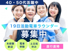 | 仕事内容 | ◎月18日活動!1日6.5時間程度×直行直帰 ◎ラウンダー業務が未経験でも大丈夫! ◎年齢不問!40代・50代・中高年・ シニアの主婦(夫)さん活躍中 \業務拡大により、増員募集!!/ オシャレ×機能的な「BRITA(ブリタ)」 キッチン雑貨(ポット型浄水器)ラウンダーのお仕事です。 世界トップシェアを持つメーカーなので、知名度もバツグン! 主婦(夫)さんなど、新たにラウンダーを始めたいと考えている方におすすめ! <報酬> 月額20万円 <経費> (1)車両使用料支給(日額1528円) (2)活動経費支給(ガソリン代、駐車場代、交通費など 例:店舗活動が17日の場合・・・ 報酬20万円+2万5976円(1)+活動経費(2) = 22万5976円+活動経費(2) <活動期間> 即日~長期 活動開始日はご相談ください <目安の活動日数> 平日のみ月18日 (会議1日を含む) <目安の活動時間> 10:00~17:30(休憩1時間) <待遇> ・携帯電話、iPad貸与 ・事前研修1日間あり(日額8000円) ・事前研修終了後、お好きなブリタ商品(ポットとボトル)をプレゼントします! <活動エリア> 千葉県千葉市・船橋市・木更津市ほか周辺エリア ・マイカーでお家から担当店舗まで直行直帰 ・1日4店舗を目安に訪問します |